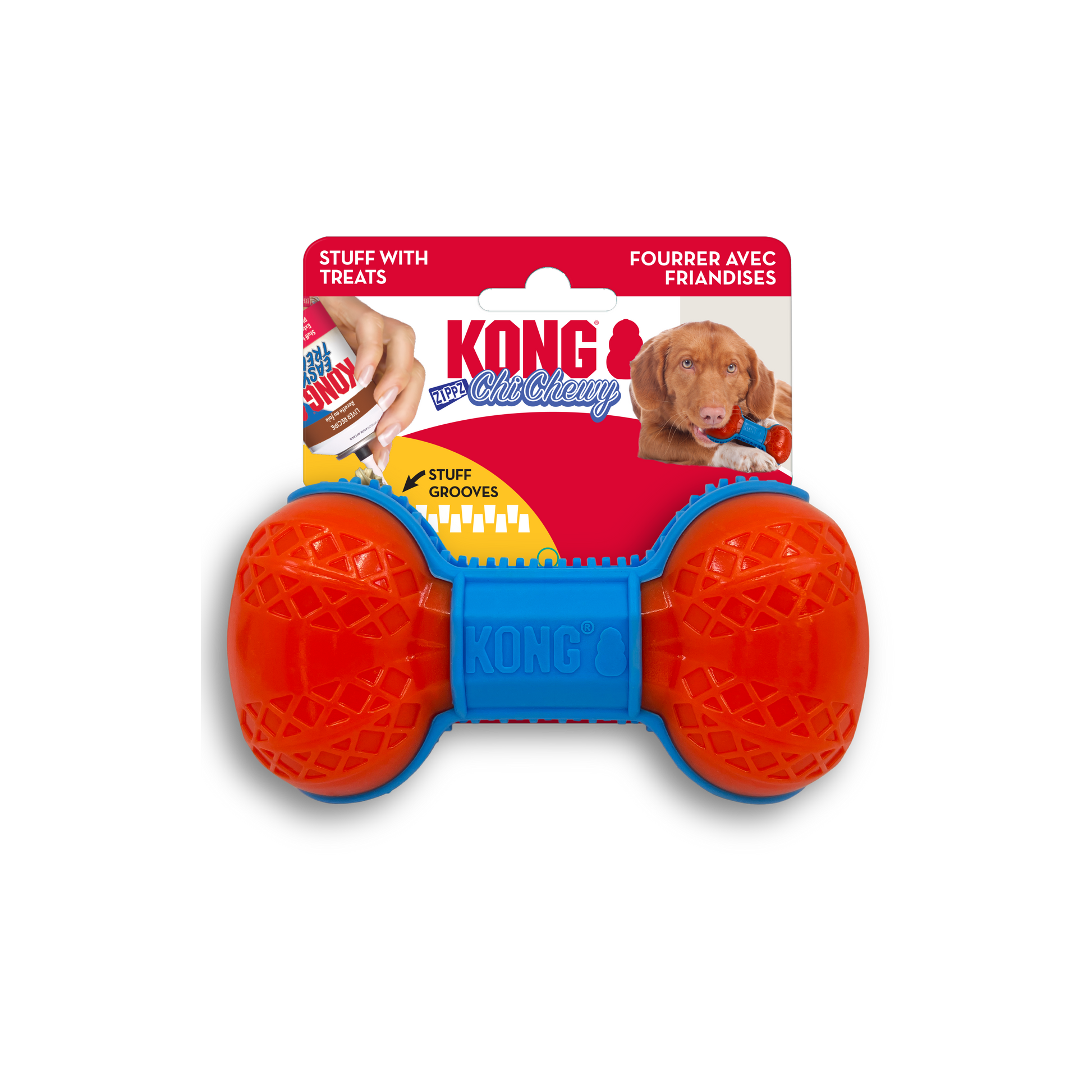 ChiChewy Zippz grooves hold treat paste for a durable toy that satisfies foraging, chewing and fetching instincts all in one. The deep grooves massage gums and clean teeth as dogs chew, with or without treats. The intriguing mix of textures captivates pups for long bouts of interactive or solo play.