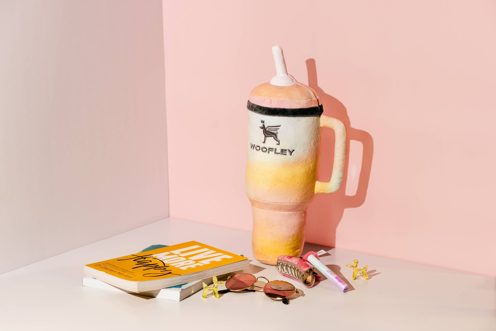 Inspired by the viral Stanley mug craze, the Woofley Tumbler brings the trend straight to your pup! Featuring soft plush, durable recycled polyester, and a large squeaker, this sustainable dog toy is perfect for tugging, tossing, and chewing - hydration optional. Always monitor your pet while they are playing with any toys. Materials are not edible.